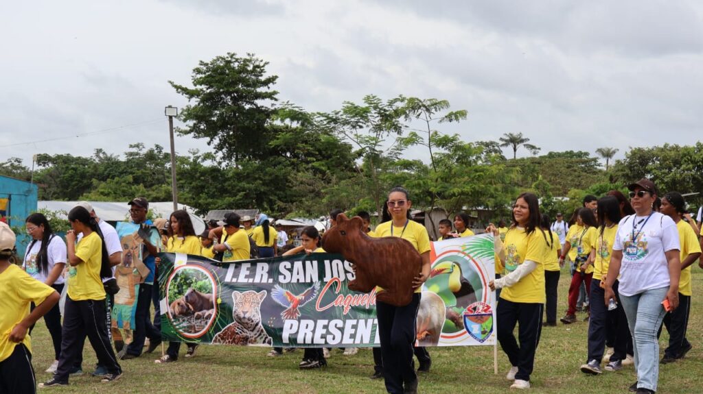 Al amanecer, el campamento despertó con el sonido del agua cayendo en las duchas y el murmullo de los niños preparándose. A las diez de la mañana comenzó el gran desfile: los estudiantes, disfrazados de chigüiros, dantas, venados, paujiles y jaguares, avanzaron por la calle principal del centro poblado mientras las familias los aplaudían desde los costados.