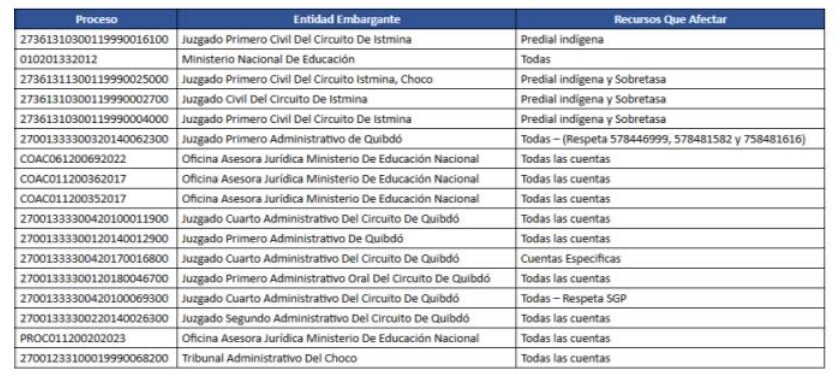 La escena no es nueva en Tadó. De hecho, la administración municipal lleva años aprendiendo a trabajar con las manos atadas. La información que el propio municipio entregó a Consonante revela la verdadera dimensión del problema: aunque el embargo sobre la cuenta del PAE —y sobre las destinadas a los resguardos indígenas— logró levantarse después de varias semanas de tensión, el resto del panorama es desolador.