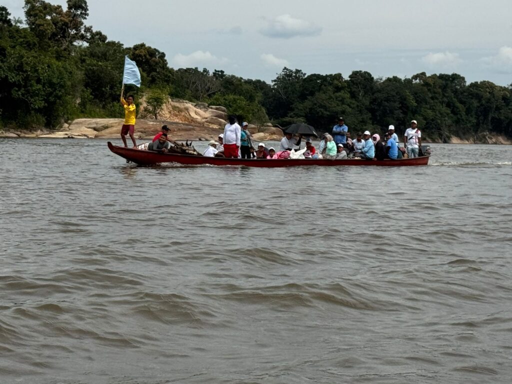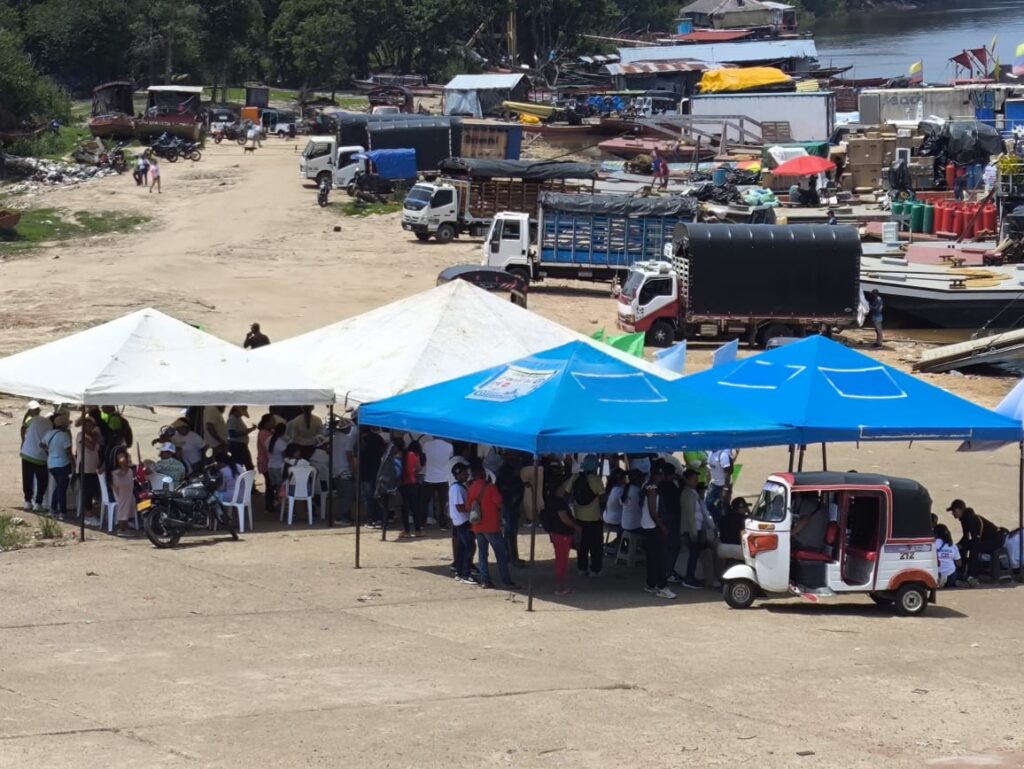 Una mujer que recibe a los indígenas y que porta distintivos de Cambio Radical dice que esperan a 4.000 personas del río, posibles votos para el candidato Carlos Cuenca. Cuando los botes llegan, todo se activa. Las personas se organizan, forman una cadena humana y comienzan a desembarcar. De mano en mano pasan bolsas, paquetes, colchonetas, ventiladores, ropa y bolsos, mientras todo es trasladado y acomodado rápidamente en los vehículos que esperan en la orilla.