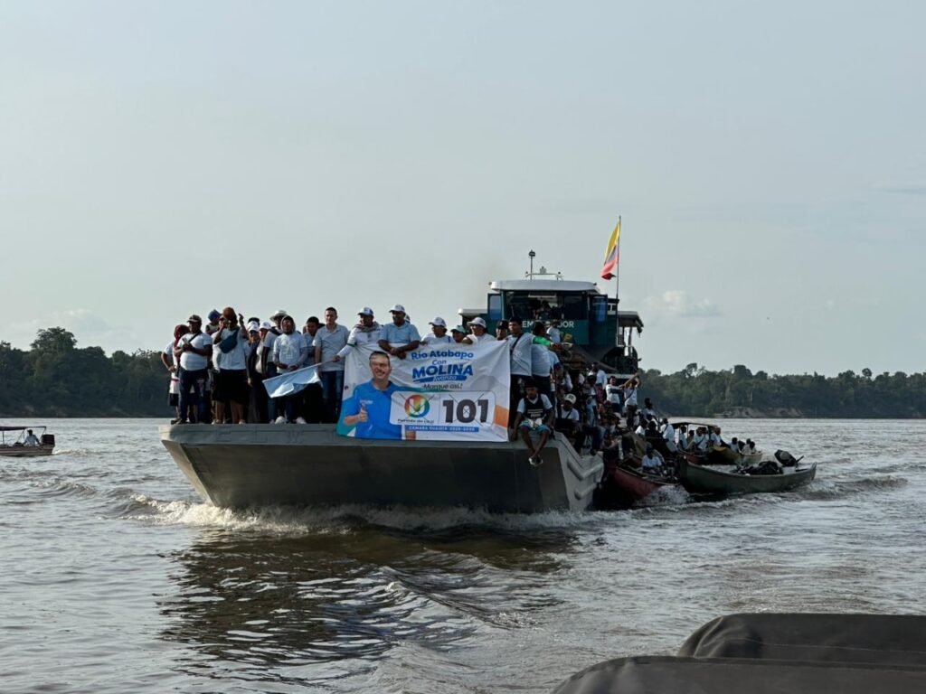 Desde el jueves, el ambiente en el puerto de Inírida es de fiesta. Decenas de botes han llegado llenos, con personas provenientes de las comunidades indígenas que habitan a lo largo de los ríos y caños de la región. En la orilla, personas vestidas con camisetas de distintos partidos políticos observan con atención cada embarcación que se acerca, tratando de identificar el color de la bandera que alguno de los tripulantes sostiene.