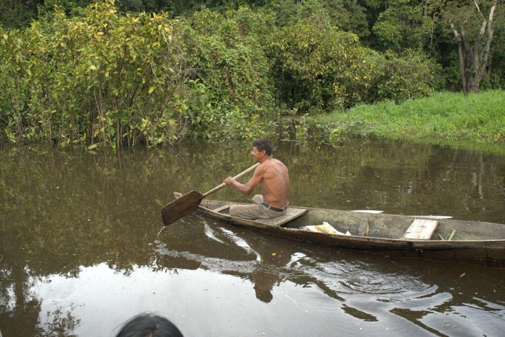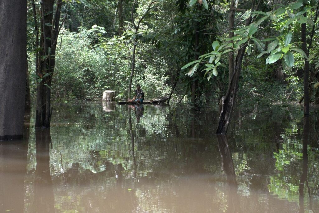 Pescador en medio de la selva inundable en una faena de pesca en los lagos de Yahuarcaca. Amazonas 2026. Fotografía: Alex Rufino.