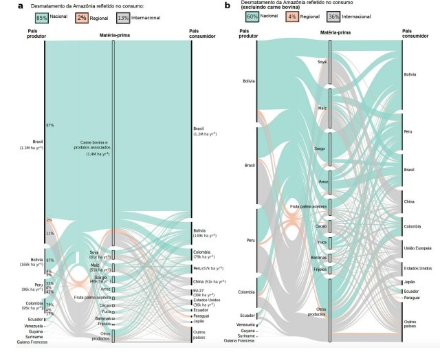 La ganadería en la Amazonía es la forma más barata de justificar la propiedad de la tierra. Entre 2018 y 2022 se estima que se han perdido 8,6 millones de hectáreas en esa región. El 78 ciento de esa deforestación esta asociada a la expansión de pastos para la ganadería, para la producción de carne y un 8 por ciento está vinculada con la expansión de la soja y el maíz. El restante 14 por ciento, consiste en una canasta de productos que incluye arroz, cacao, café, palma y otros. Existen marcadas diferencias en estas dinámicas al interior de la Amazonía. En la Amazonía oriental hay una presión ganadera muy fuerte y en la occidental, sobre todo en las fronteras agrícolas de Perú y Bolivia, hay una presión más fuerte de los cultivos agrícolas.