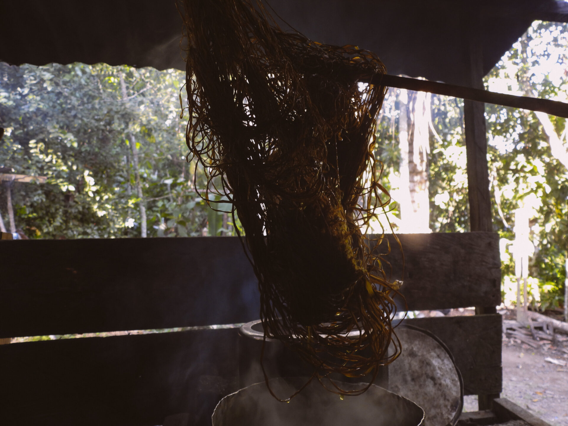 También es alimento, dice Rosy Rivero, una de las hijas de la familia que trabaja como artesana: “Hace parte de nuestro alimento, porque tenemos el cernidor, que es el colador para sacar el almidón de la yuca, y el canasto para transportar los productos de la chagra a la casa: la yuca, el plátano, la piña”.