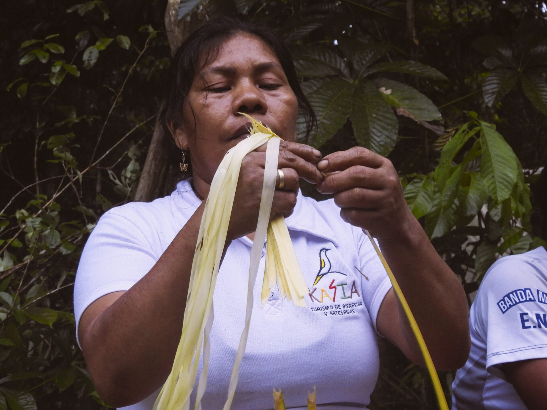 Del otro lado, las orillas del río Amazonas, en Puerto Nariño, Nohora Insapillo, tejedora del pueblo Cocama, relata cómo utiliza otra planta, la chambira (Astrocaryum chambira), una palma espinosa empleada para la elaboración de mochilas, collares, manillas y otras artesanías. Para Nohora, tejer es su historia, “la forma en la cual voy hilando, torciendo y uniendo fibras que resaltan mi cultura”.