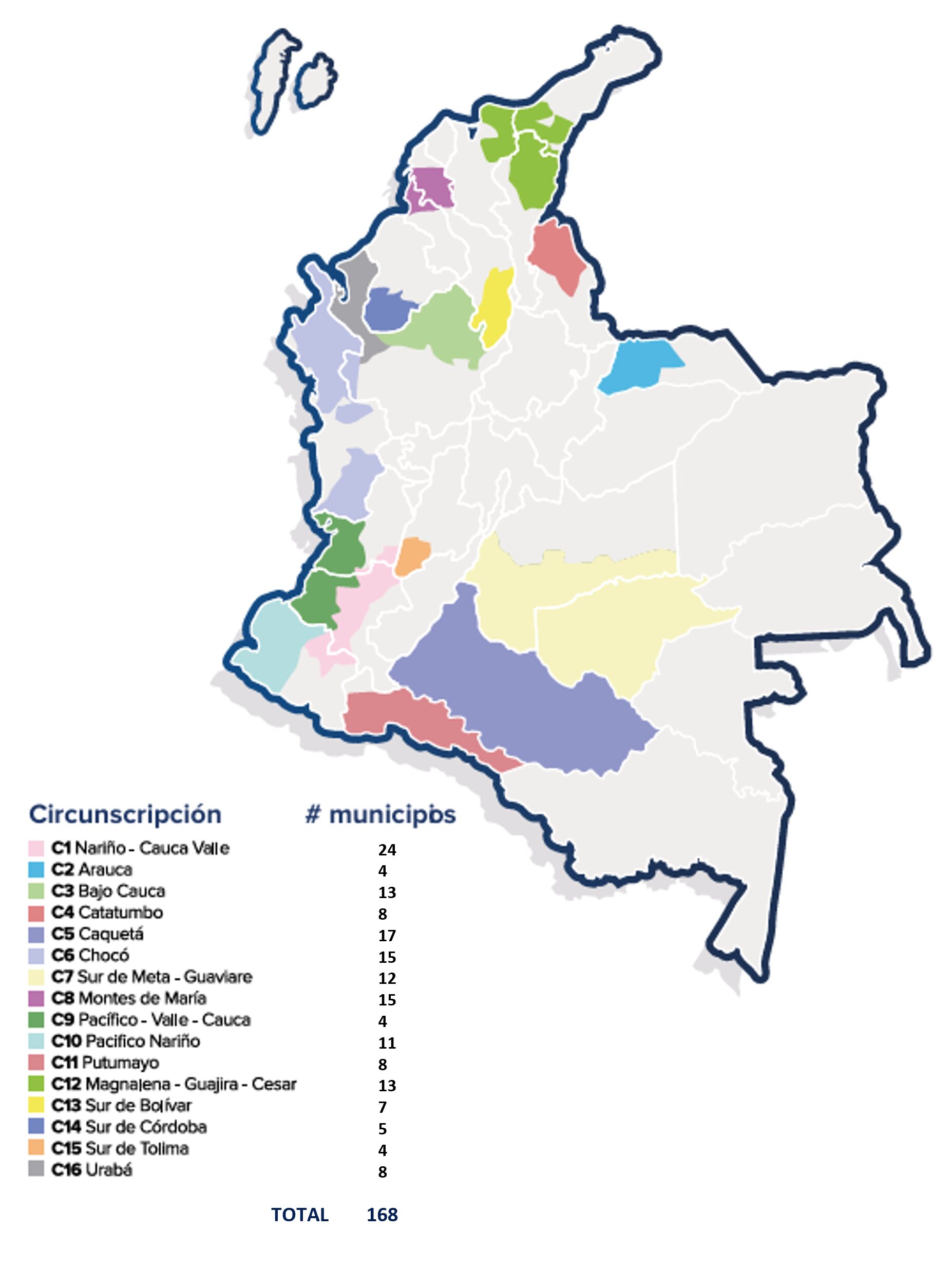 Las circunscripciones de paz representan a 168 municipios —en 19 departamentos— que fueron priorizados por ser los territorios más afectados por el conflicto armado, con mayores índices de pobreza, presencia de economías ilícitas y debilidad institucional.