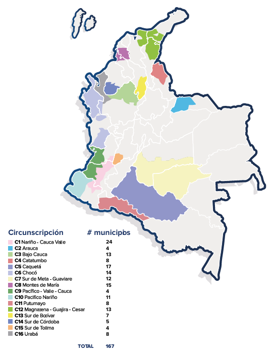 Las circunscripciones de paz representan a 167 municipios —en 19 departamentos— que fueron priorizados por ser los territorios más afectados por el conflicto armado, con mayores índices de pobreza, presencia de economías ilícitas y debilidad institucional.