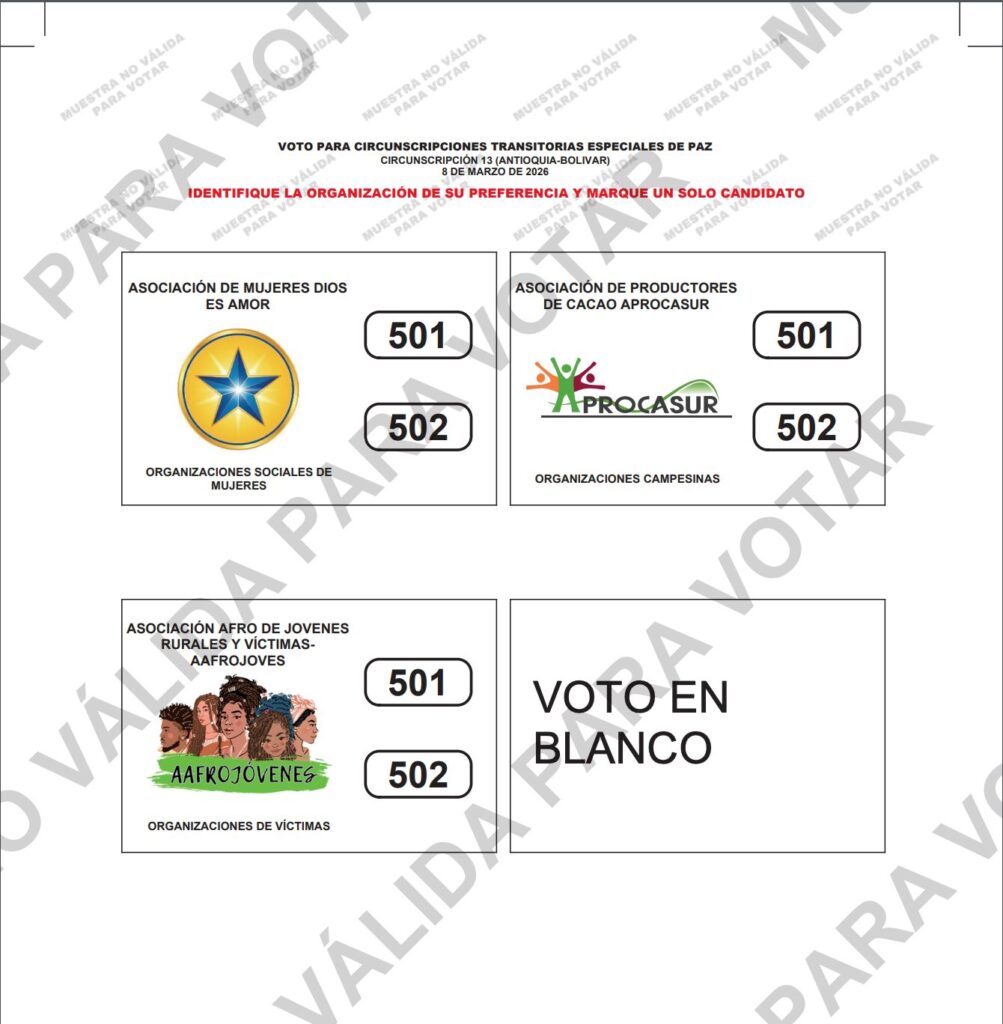 Un ejemplo de tarjetón para la Citrep 13, del Sur de Bolívar, luce así: