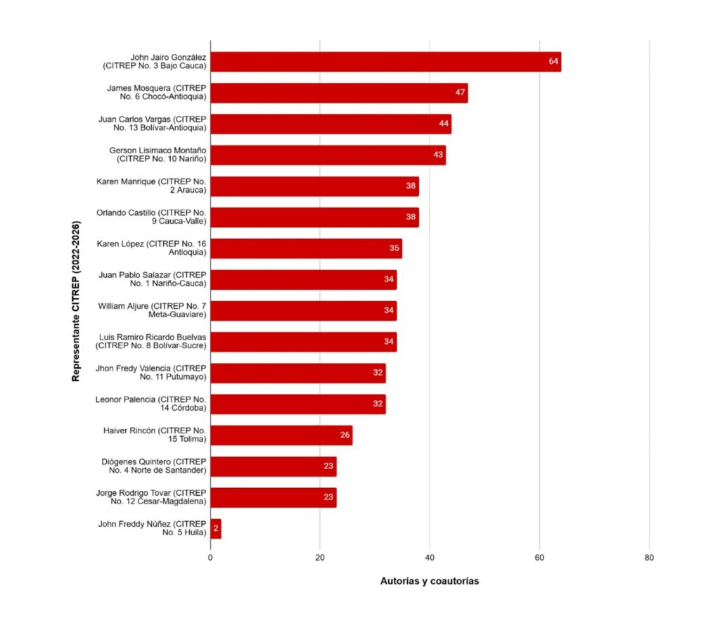 Además, la mayoría había participado en menos de 10 debates de control político. “Esto puede explicarse porque un gran bloque de los Citrep hace parte de la bancada de gobierno, acompañan los proyectos de ley del presidente Petro y votan afirmativo a sus iniciativas y reformas”, precisa la organización. También señala que realizaron, en promedio, 18 ponencias y 4 audiencias públicas.